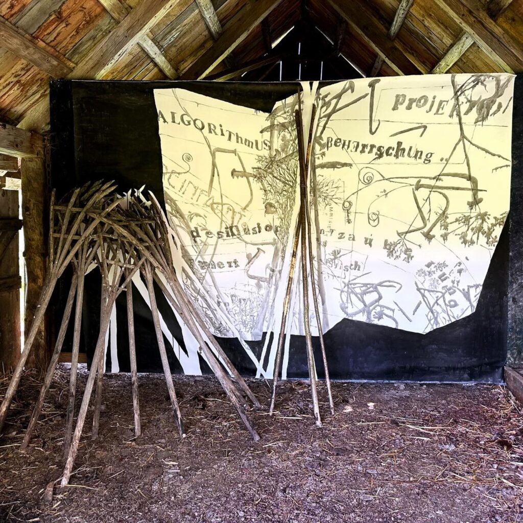 As part of our outreach activities, we were commissioned (through the arts & science collective The ZoNE), to contribute to the event called “Landmaschine” (“land machine”) at Schloss Lind, a museum for art and local history in Styria, Austria, where we will also have an exhibition next year. Our activities at the Schloss can be subdivided into three parts: (1) a projection display (of project-related videos, among other animated elements) on the front facade of the castle, plus (2/3) two installations in the former sheep stable on the domain (one on each side of the building), which we used to address the problem of looking at the world as a machine (the theme of our book, “Beyond the Age of Machines“). These installations juxtapose and integrate technology and mechanisms with the natural processes of the castle garden, and the local insect life attracted by our projections. Parts of the installation remain over winter, exposed to the weather, to be revisited and reactivated next year during our exhibition. Actions such as these are powerful interventions demonstrating our philosophical and scientific approach in applied settings, to audiences not usually exposed to academic presentations or scientific research of the abstract kind we are engaged in.Artwork by Marcus Neustetter and Bronwyn Lace.