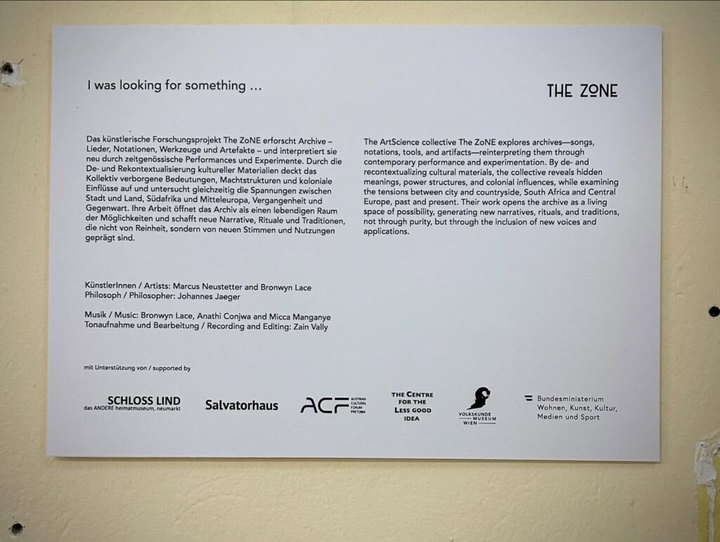 I was looking for something … and The ZoNE with support from: Volkskundemuseum Wien, Das Andere Heimatmuseum / Schloss Lind, SalvatorHaus, The Centre for the Less Good Idea, the Austrian Cultural Forum Pretoria, and the Federal Ministry of Housing, Arts, Culture, Media, and Sport.